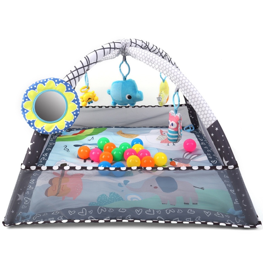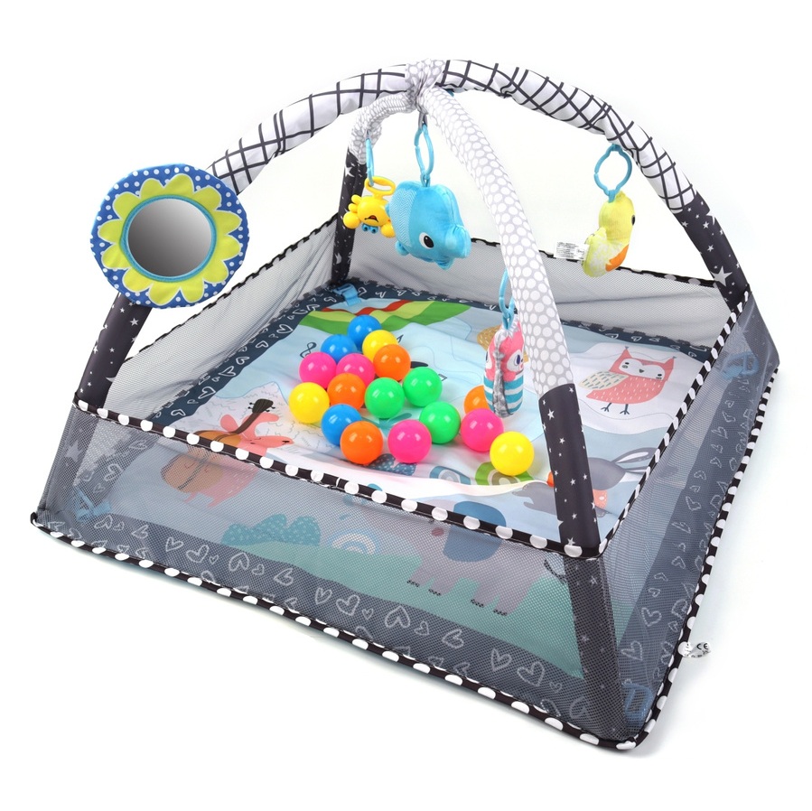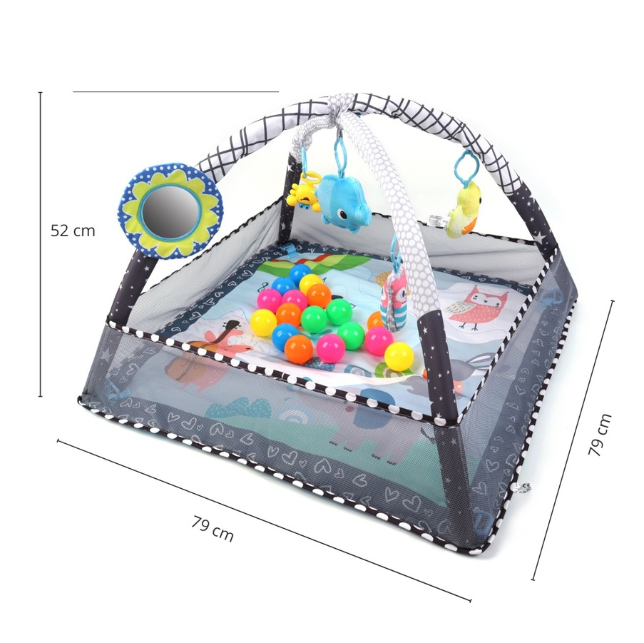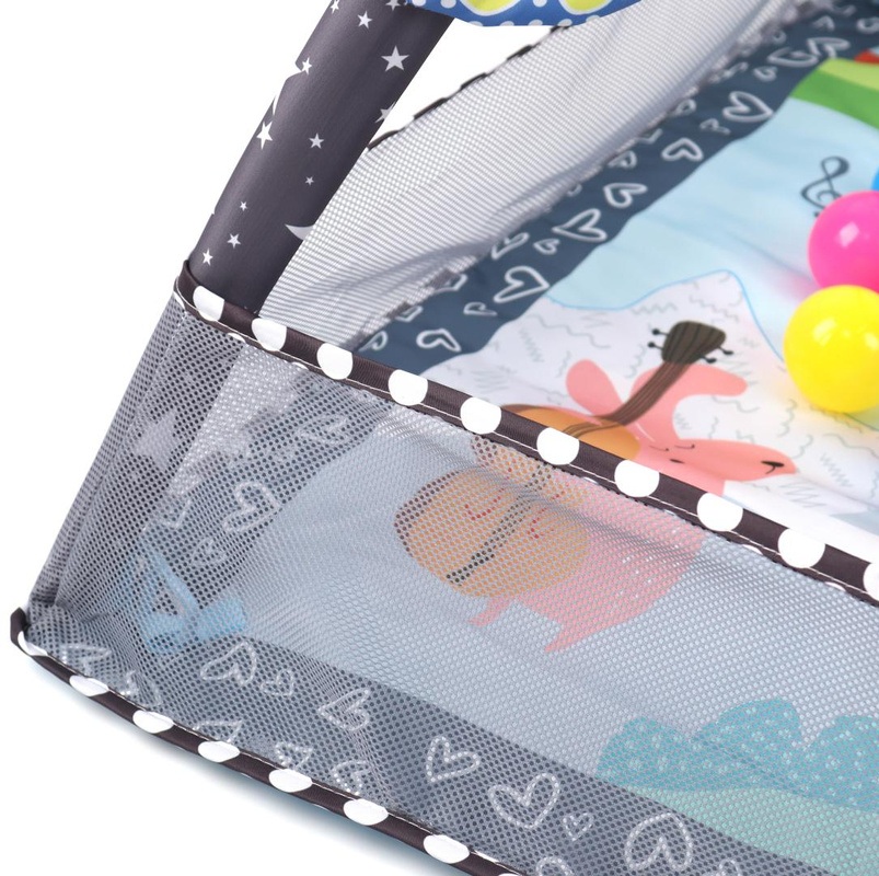 Podignute, prozračne mrežaste stijenke pretvaraju podlogu za igru u sigurnu ogradicu za igru ispunjenu s 20 šarenih loptica. Beba se može igrati okružena igračkama i mekim stijenkama koje pružaju sigurnost i udobnost.