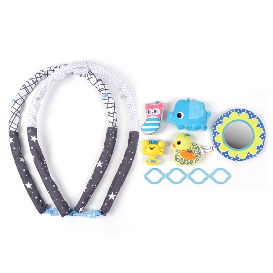 Igračke se mogu lako pričvrstiti ili odvojiti – svaka ima zvučne, taktilne i vizualne elemente koji stimuliraju bebina osjetila.