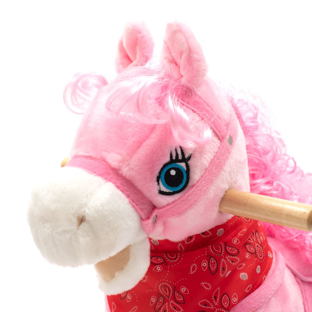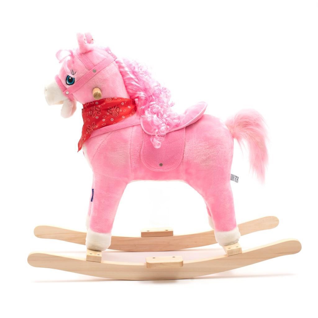 Iznimno lijep konjić za ljuljanje pink s crvenim šalom na vratu oduševiti će malu jahačicu. Kada stisnete označene gumbe na ušima konjić počinje mahati repom, otvarati usta. Dodatno ispušta zvukove kasa ili pjeva veselu pjesmu. Udobno sedlo, čvrsta uzda, drvene ručke i metalni stremeni pružit će vašoj kaubojki još veću stabilnost i udobnost tijekom igre i ljuljanja.