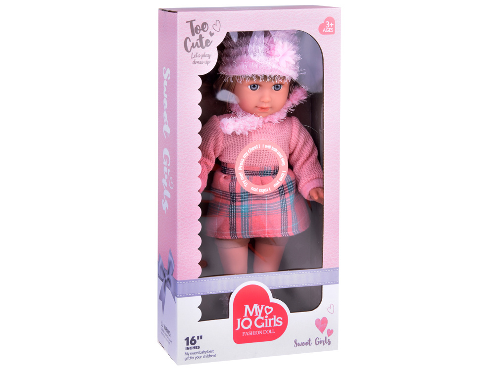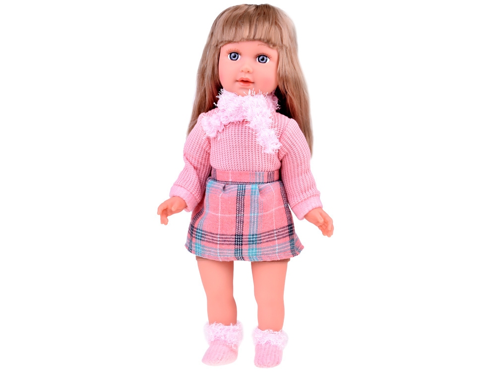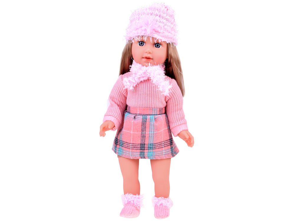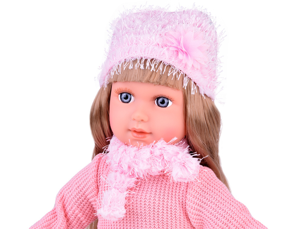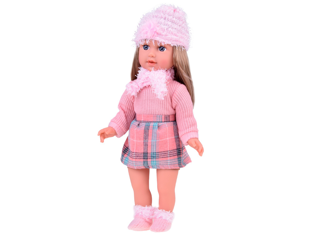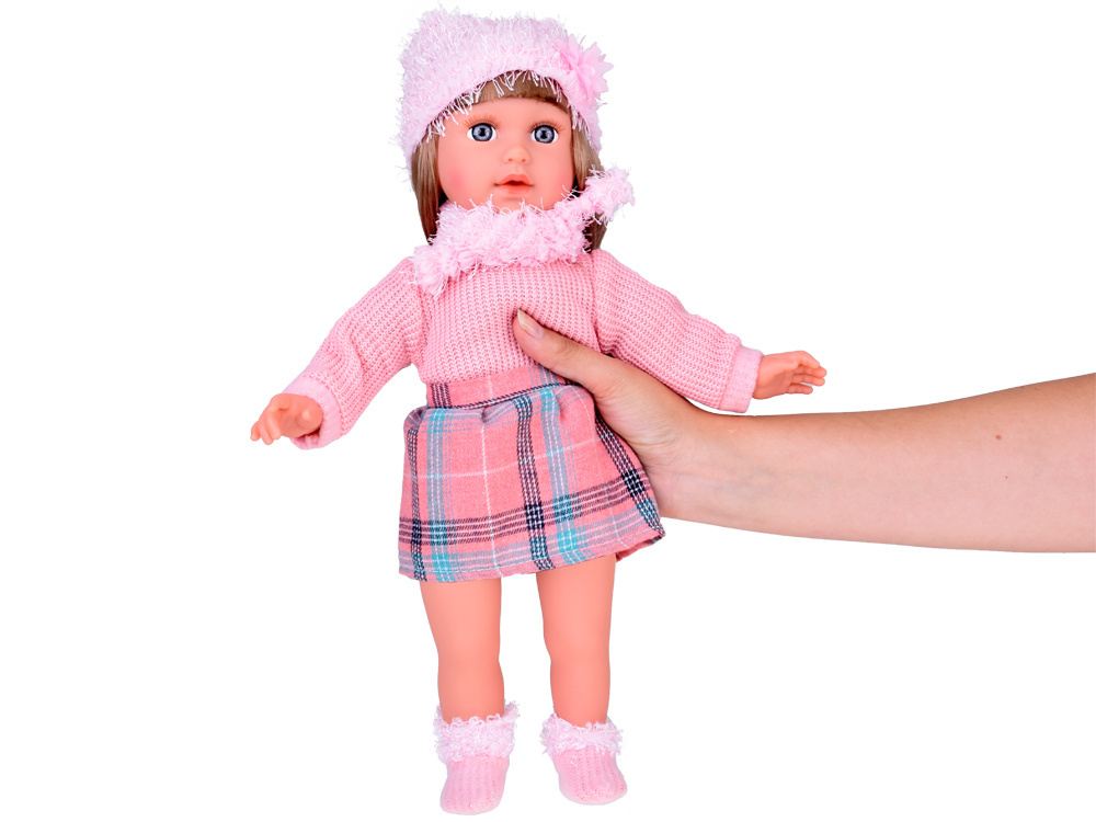 Lutka Kate koja govori Engleski i uz koju će vaše dijete naučiti jednostavne fraze na engleskom! Elegantna lutka odjevena je u ružičasti džemper, kockastu mini suknju i čarape, šal i kapu s ukrasnim obrubom. Visoka je 42 cm.